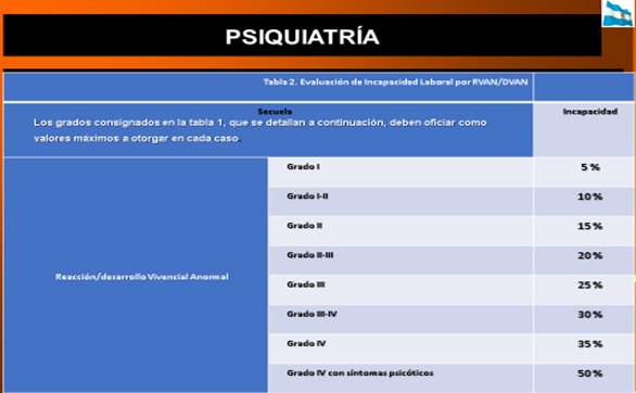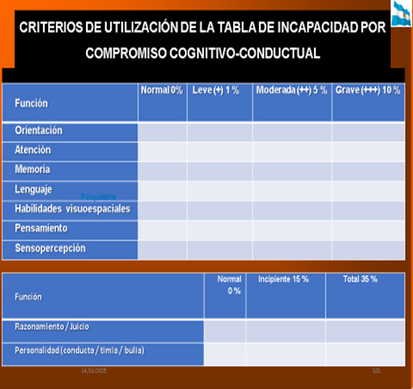 - Hace referencia a la “TABLA DE INCAPACIDAD POR COMPROMISO COGNITIVO CONDUCTUAL”, en la misma las funciones psíquicas se suman aritméticamente hasta llegar al 100% de incapacidad.