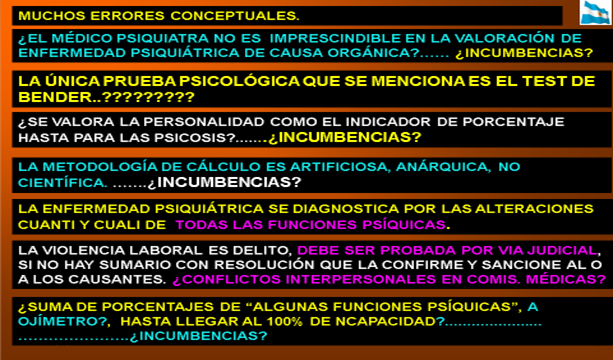 - No se han incorporado en el presente informe para no extenderlo una multiplicidad de errores conceptuales semiológicos, que confunden lo normal con lo patológico médico, producto de la ignorancia en el tema, errores que sin duda inciden en las evaluaciones trastocando el diagnóstico correcto y el porcentaje, sobre todo porque el Baremo es aplicable por distintos profesionales con formación laboral, pero no todos tienen formación psiquiátrica clínica.