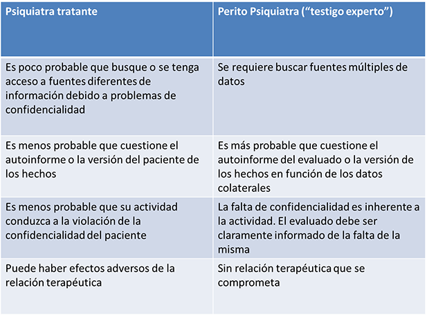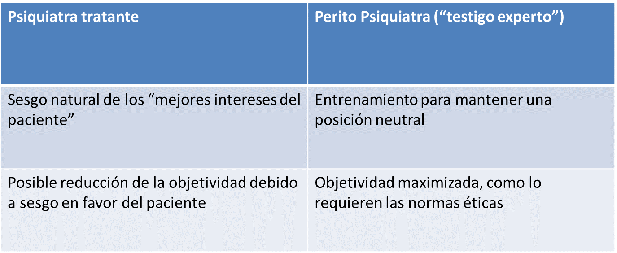 Según el libro de texto de Psiquiatría Forense, de la Asociación Norteamericana de Psiquiatría (en su tercera edición, 2018, y vinculada al DSM 5); los roles como psiquiatra tratante Vs. Actividad Pericial pueden desarrollar áreas de conflicto. Por esto debe tenerse en cuenta: