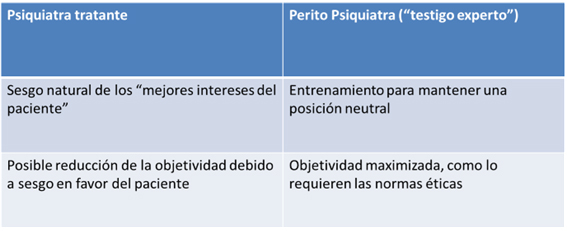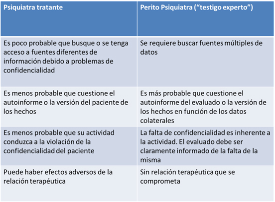 Según el libro de texto de Psiquiatría Forense, de la Asociación Norteamericana de Psiquiatría (en su tercera edición, 2018, y vinculada al DSM 5); los roles como psiquiatra tratante Vs. Actividad Pericial pueden desarrollar áreas de conflicto. Por esto debe tenerse en cuenta: